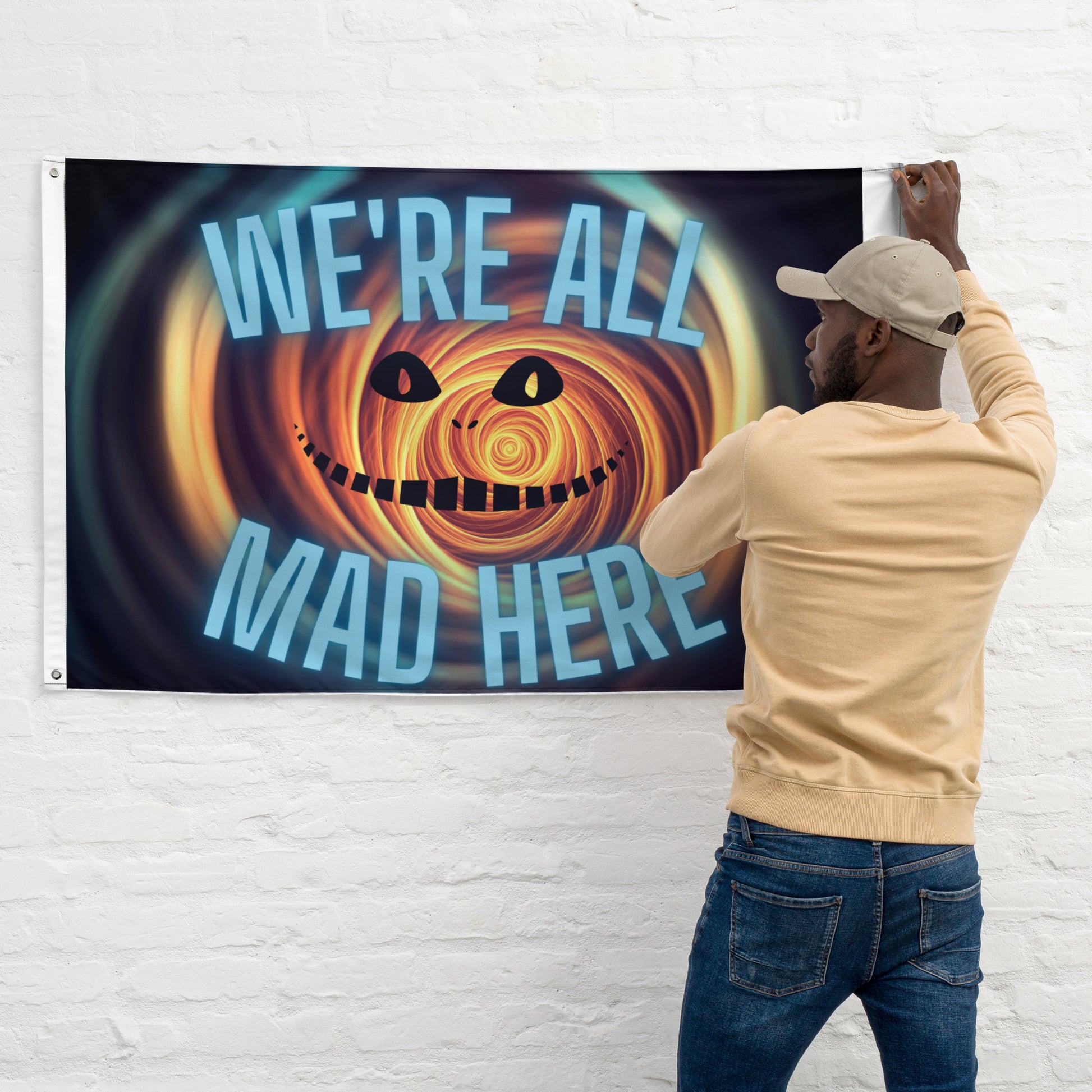 Instant Icebreaker: Striking up conversations with fellow festival-goers has never been easier. This captivating design featuring Cheshire the cat and the whimsical "We're All Mad Here" text sparks curiosity and connects you with kindred spirits.
